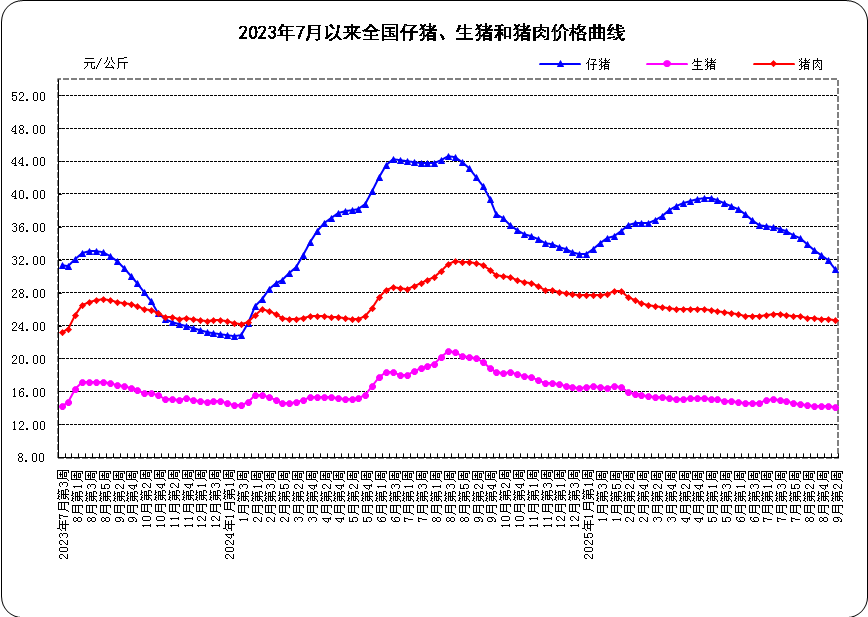 生猪产品价格。全国仔猪平均价格30.96元/公斤,比前一周下跌3.3%,同比下跌26.5%。青海仔猪价格上涨,上海、天津、浙江、福建、陕西等27个省份仔猪价格下跌,宁夏价格持平。华南地区价格较高,为32.89元/公斤;东北地区价格较低,为29.47元/公斤。全国生猪平均价格14.10元/公斤,比前一周下跌1.3%,同比下跌29.7%。海南、青海、重庆3个省份生猪价格上涨,广东、上海、广西、黑龙江、安徽等27个省份生猪价格下跌。华南地区价格较高,为15.20元/公斤;东北地区价格较低,为13.32元/公斤。全国猪肉平均价格24.70元/公斤,比前一周下跌0.5%,同比下跌22.1%。北京、新疆、陕西、海南、贵州等7个省份猪肉价格上涨,黑龙江、内蒙古、山东、宁夏、江西等21个省份猪肉价格下跌,上海、四川价格持平。华南地区价格较高,为27.65元/公斤;东北地区价格较低,为21.35元/公斤。