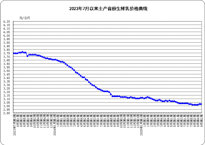 生鲜乳价格。内蒙古、河北等10个主产省份生鲜乳平均价格3.03元/公斤,与前一周持平,同比下跌3.5%。