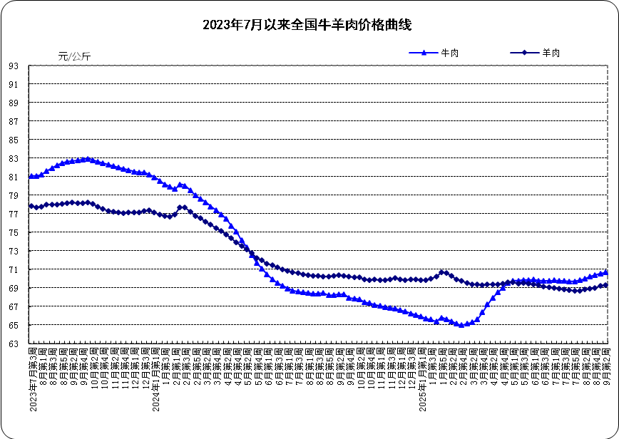 牛羊产品价格。全国牛肉平均价格70.67元/公斤,比前一周上涨0.2%,同比上涨3.4%。河北、内蒙古等10个主产省份牛肉价格64.91元/公斤,比前一周上涨0.1%。主产省份活牛价格27.16元/公斤,比前一周上涨0.1%,同比上涨10.9%。全国羊肉平均价格69.30元/公斤,比前一周上涨0.1%,同比下跌1.5%。河北、内蒙古等10个主产省份羊肉价格66.96元/公斤,比前一周上涨0.1%。主产省份活羊价格28.96元/公斤,比前一周上涨0.2%,同比上涨0.4%。
