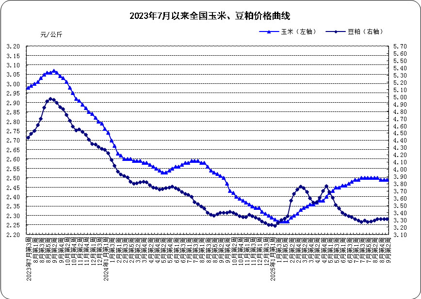 饲料价格。全国玉米平均价格2.49元/公斤,与前一周持平,同比下跌0.8%。主产区东北三省玉米价格为2.33元/公斤,比前一周上涨0.9%;主销区广东省玉米价格2.54元/公斤,比前一周下跌0.4%。全国豆粕平均价格3.31元/公斤,与前一周持平,同比下跌2.6%。育肥猪配合饲料平均价格3.40元/公斤,与前一周持平,同比下跌1.7%。肉鸡配合饲料平均价格3.51元/公斤,与前一周持平,同比下跌1.7%。蛋鸡配合饲料平均价格3.24元/公斤,比前一周上涨0.3%,同比下跌1.2%。
